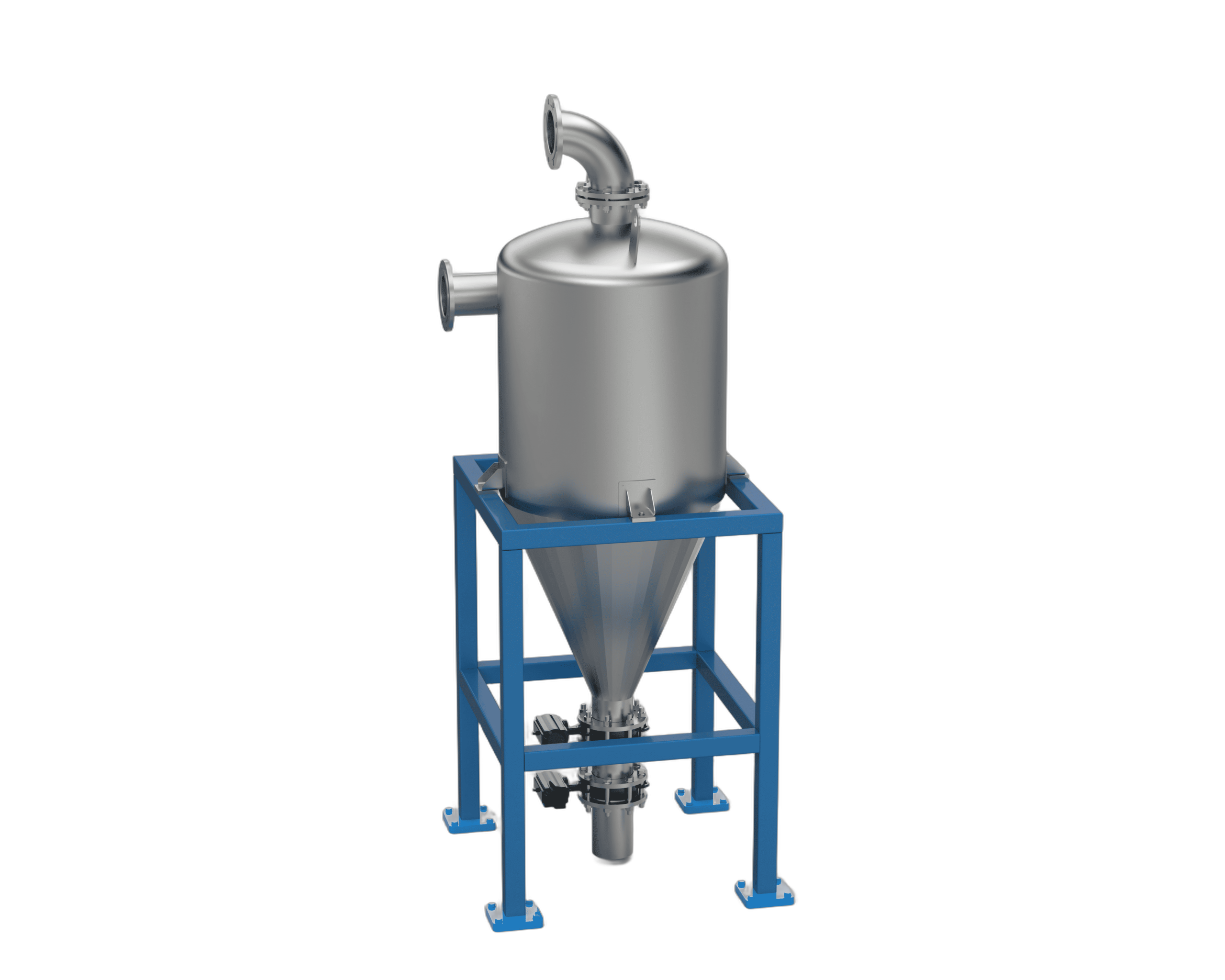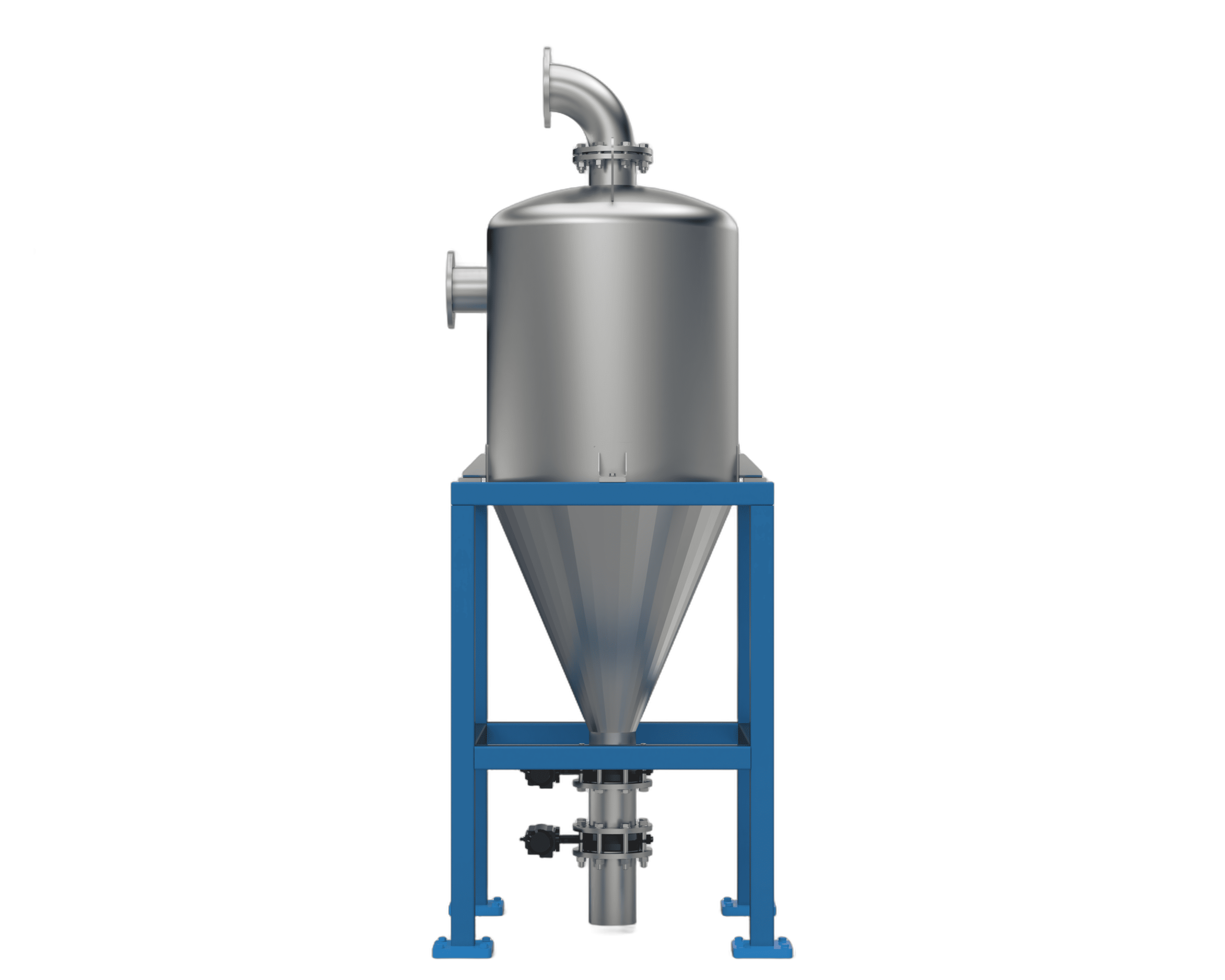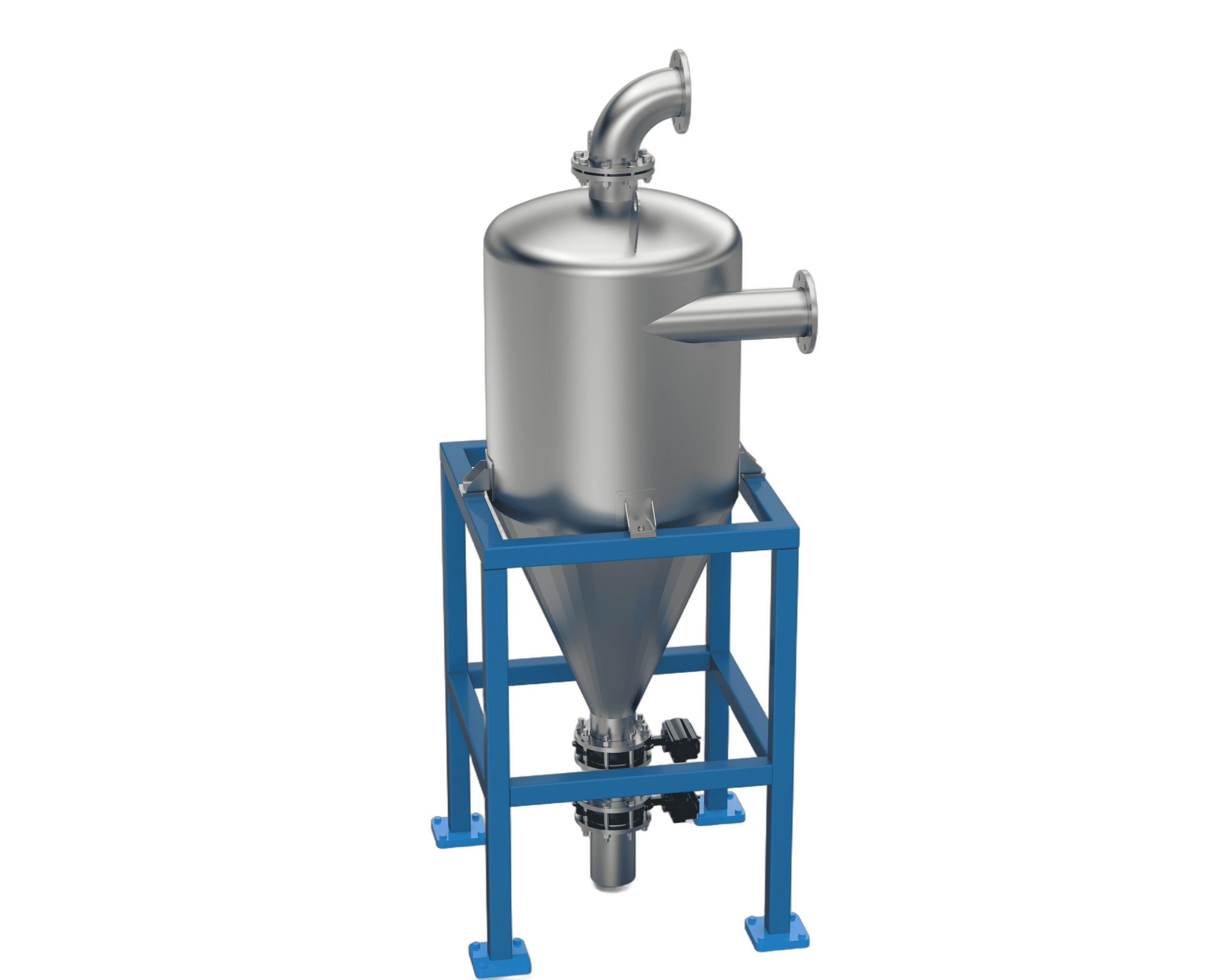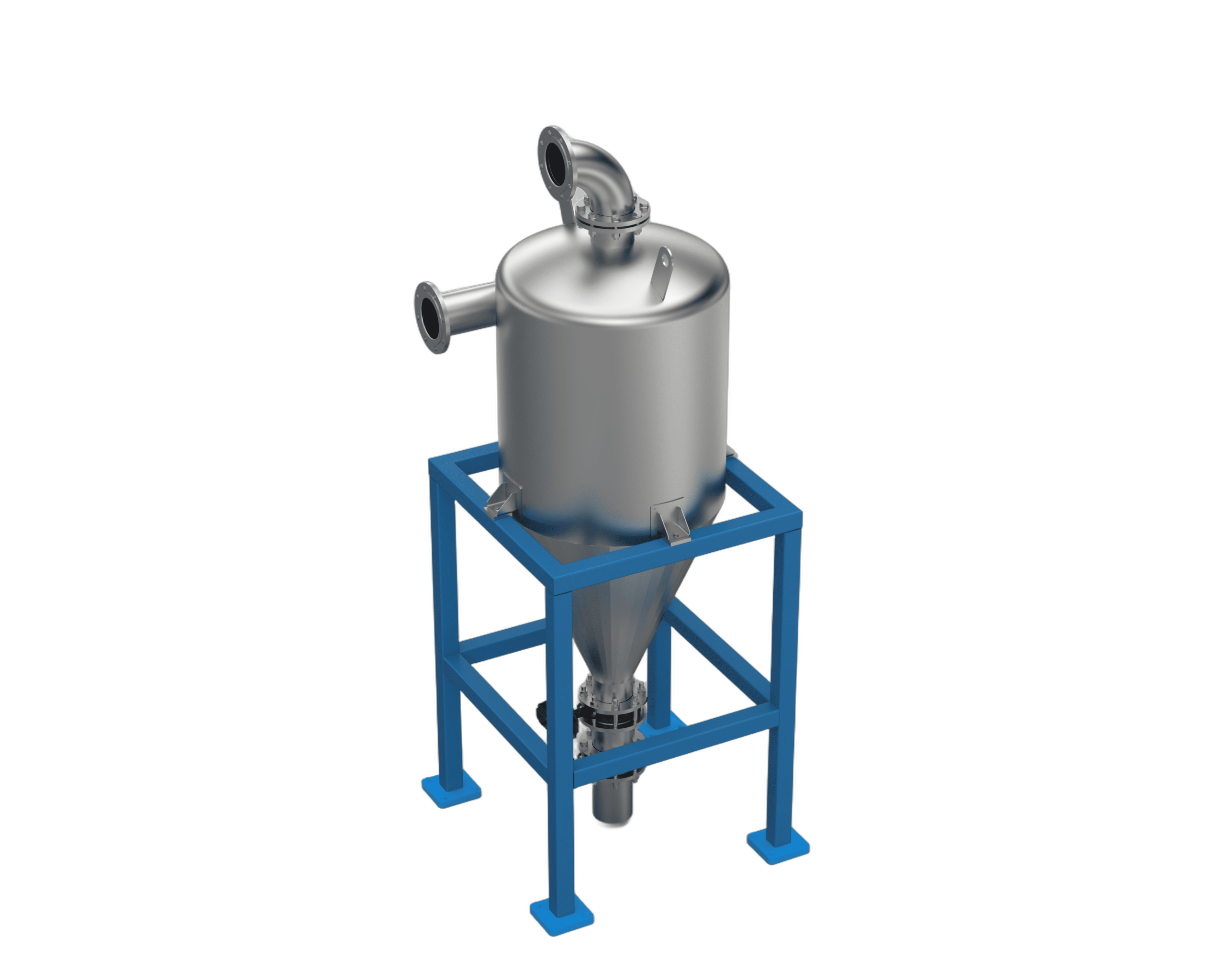 含尘气体进入并形成旋转螺旋流;离心力将颗粒甩向壁面,颗粒落下并被排出,而干净的气体则从中心排出。
